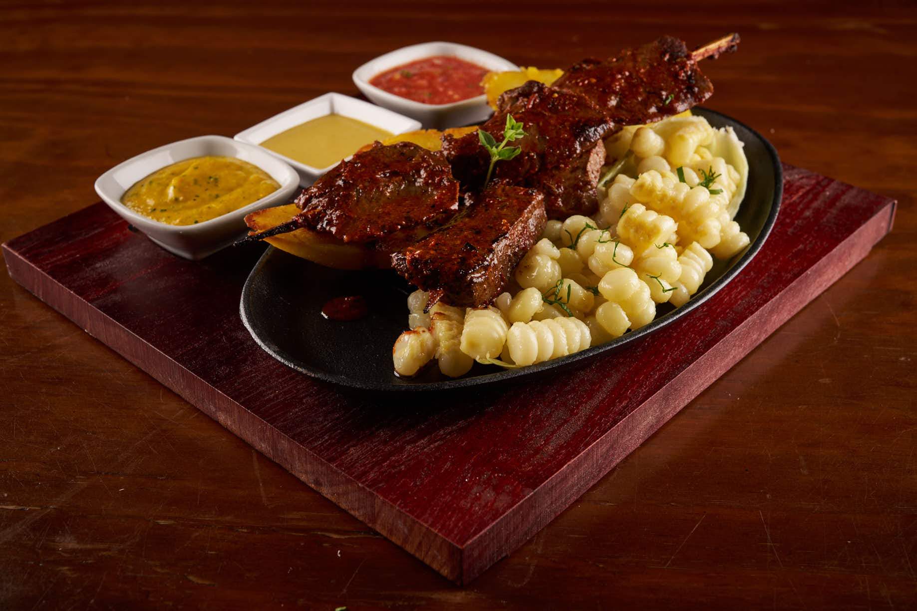 Un clásico peruano lleno de sabor: corazón de res marinado en salsa anticuchera, asado a la perfección y acompañado de papa dorada.