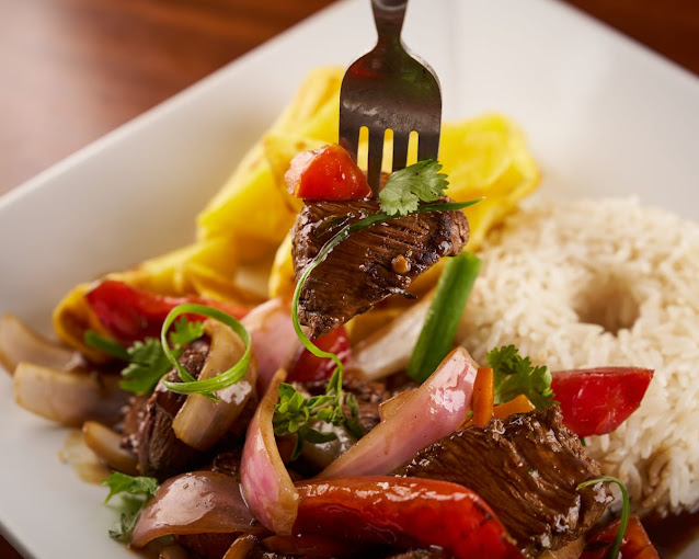Un plato lleno de sabor y tradición: risotto de quinoa cocinado con ají amarillo y crema de leche, acompañado de jugosos trozos de lomo saltado con cebolla y tomate. Una fusión perfecta de texturas y aromas que deleita el paladar.